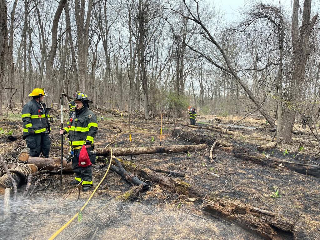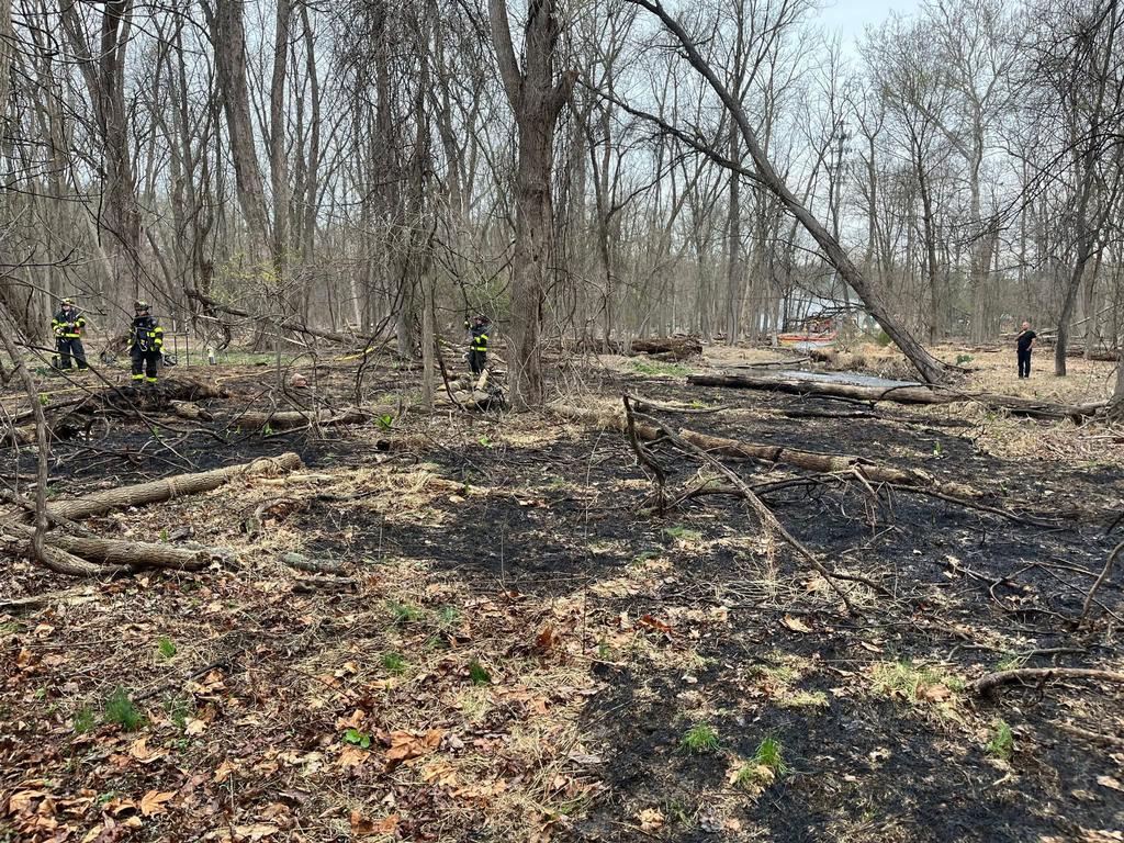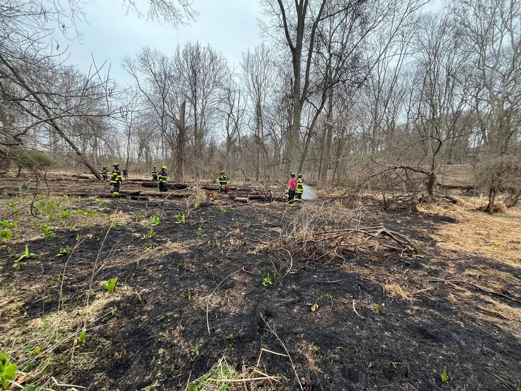 | Upon arrival, units confirmed an active brush fire burning approximately 600 feet into the woods, requiring a coordinated effort to prevent further spread.